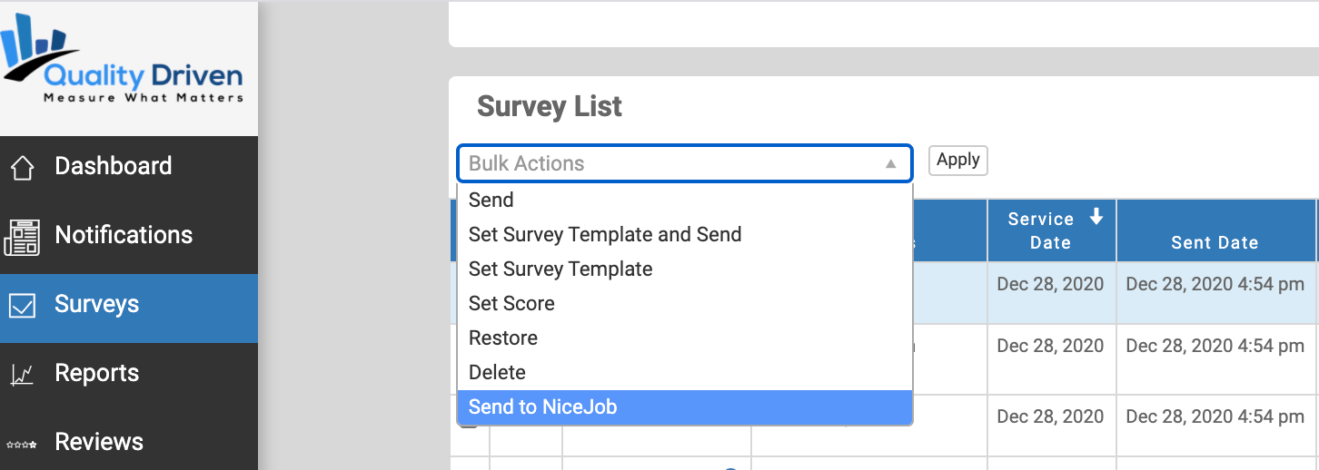 2. On the left hand side of the survey IDs, you will see checkboxes. we would want to select the boxes to highlight the surveys we want to enroll in NiceJob follow-up and then at the top of the survey list we want to select the "Bulk Actions" dropdown and hit "Send to NiceJob"